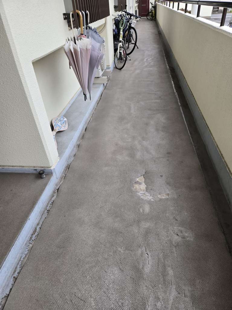 高崎市Aハイツ様マンションの共用通路・階段の長尺シート、小屋根の塩ビシート防水張替工事になります。既存のシートが経年劣化により剥がれておりました。既存のシートを全面撤去後、端部には線防水にてウレタン防水。平場と階段にはタキロンの長尺シート、階段にはタキステップを張りました。小屋根はゴムシートでしたが、全て撤去し、塩ビシート密着工法にて施工。大きいマンションでしたので日数はかかりましたが、無事完了いたしました。